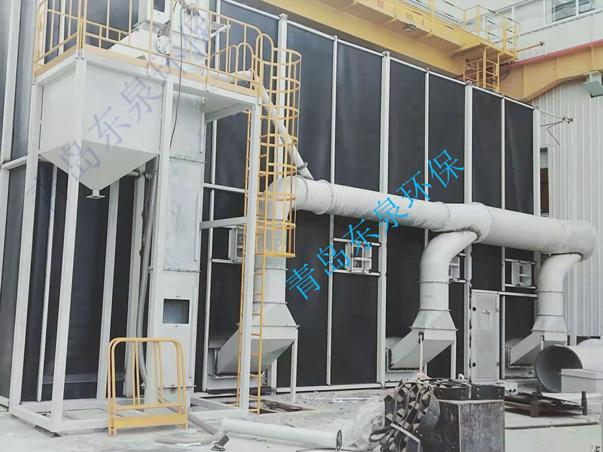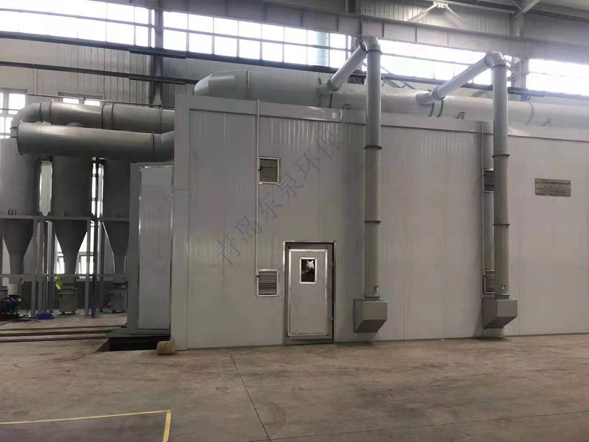 砂料回收、分离及除尘系统的工作原理:喷砂时砂料掉落到蜂窝漏斗里,再由气缸带动刮板往复运动,使落入漏斗内的砂料推送到喷砂房一端的螺旋输送机里面,通过螺旋输送机输送到皮带输送机内,皮带输送机等把砂料送入风选分离器中,风选分离器将砂料分离至储料斗,从而保持砂料的清洁度和纯度,有用的砂料进入储砂罐内继续循环使用,粉尘及污物则随气流进入除尘系统内,经过除尘系统的过滤、干净空气排入大气,粉尘及污物则储存在粉尘筒中等待定期清理。